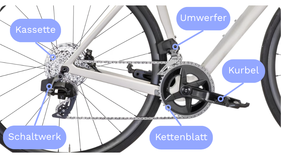 Die Übersetzung beschreibt das Verhältnis zwischen den Zähnen am Kettenblatt (vorne) und denen am Ritzel (hinten). Sie bestimmt vereinfacht gesagt, wie oft sich das Hinterrads bei einer Kurbelumdrehung dreht. Mit einer höheren Übersetzung (mehr Zähne vorne / weniger hinten) fährst du schneller bei geringer Trittfrequenz, mit einer niedrigeren Übersetzung (weniger Zähne vorne / mehr hinten) benötigst du beim Bergauffahren oder beim Anfahren weniger Kraft.